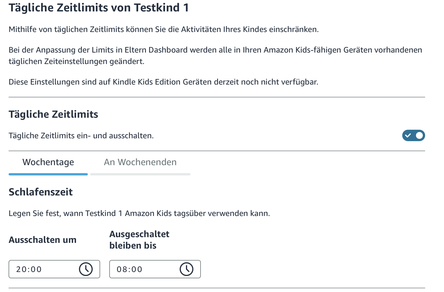 Das Amazon Kids-Profil bietet Eltern die Möglichkeit, auf Tablets, Smart-TV-Systemen oder Echo- Geräten von Amazon Kinderschutzeinstellungen vorzunehmen. Eltern können unter anderem Zeitlimits festlegen oder die Nutzung bestimmter Kategorien - wie Apps und Videos - einzuschränken. Alle Einstellungen können Sie über das Eltern-Dashboard von Amazon vornehmen.