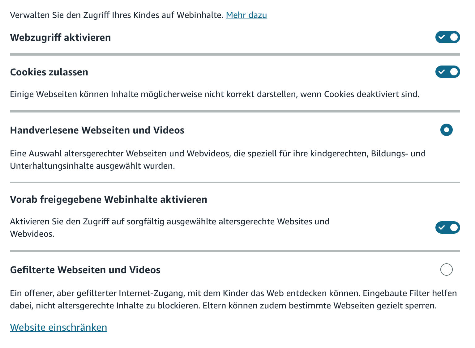 Bei Amazon Kids gibt es einen speziellen Webbrowser, der für Kinder konzipiert wurde. Sie haben hier die Auswahl zwischen einem Webbrowser, der nur Inhalte für Kinder anzeigt und sich nach dem Altersbereich richtet, den Sie ausgewählt haben oder einem offenen Zugang, indem Sie jedoch bestimmte Webseiten sperren können.