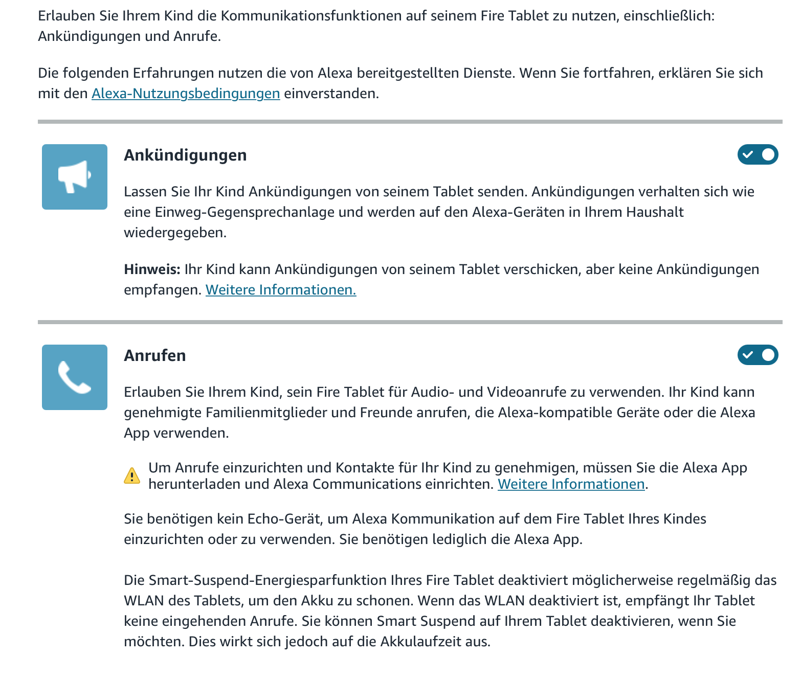 Im Bereich Kommunikation haben Sie die Möglichkeit, Ihrem Kind zu erlauben, über das Tablet zu kommunizieren. Achtung: Diese Einstellungen funktionieren nur mit Alexa-Geräten und der Alexa-App. Sie können Ihrem Kind erlauben über das Tablet Ankündigungen zu versenden, die dann auf den Alexa-Geräten wiedergegegeben werden. Zusätzlich gibt es die Möglichkeit Anrufe an bestimmte Kontakte zu erlauben.
