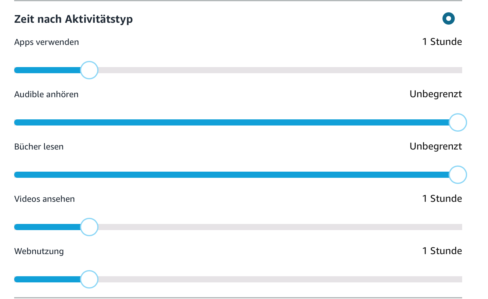 Sie haben die Möglichkeit im Bereich Zeit nach Aktivitätstyp einzustellen. Beispielsweise soll Ihr Kind nur 15 Minuten Videos anschauen können, aber 30 Minuten andere Apps nutzen können.