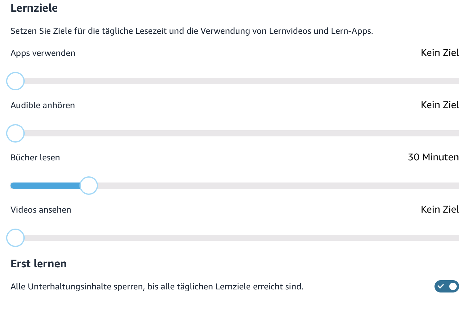 Im Bereich Lernziele haben Sie die Möglichkeit Lernziele für Ihr Kind zu setzen. Beispielsweise soll Ihr Kind eine bestimmte Zeit mit einer Lern-App verbringen. Zusätzlich können Sie einstellen, dass zuerst die Lernziele erreicht werden sollen, bevor Ihr Kind andere Apps wie Spiele nutzen kann.