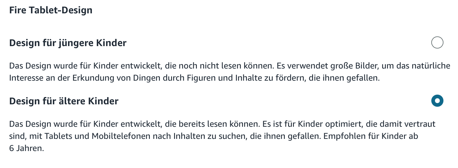 Im Bereich Fire Tablet-Design können Sie das Design des Tablets auswählen. Es gibt ein Design für jüngere Kinder und für ältere Kinder.